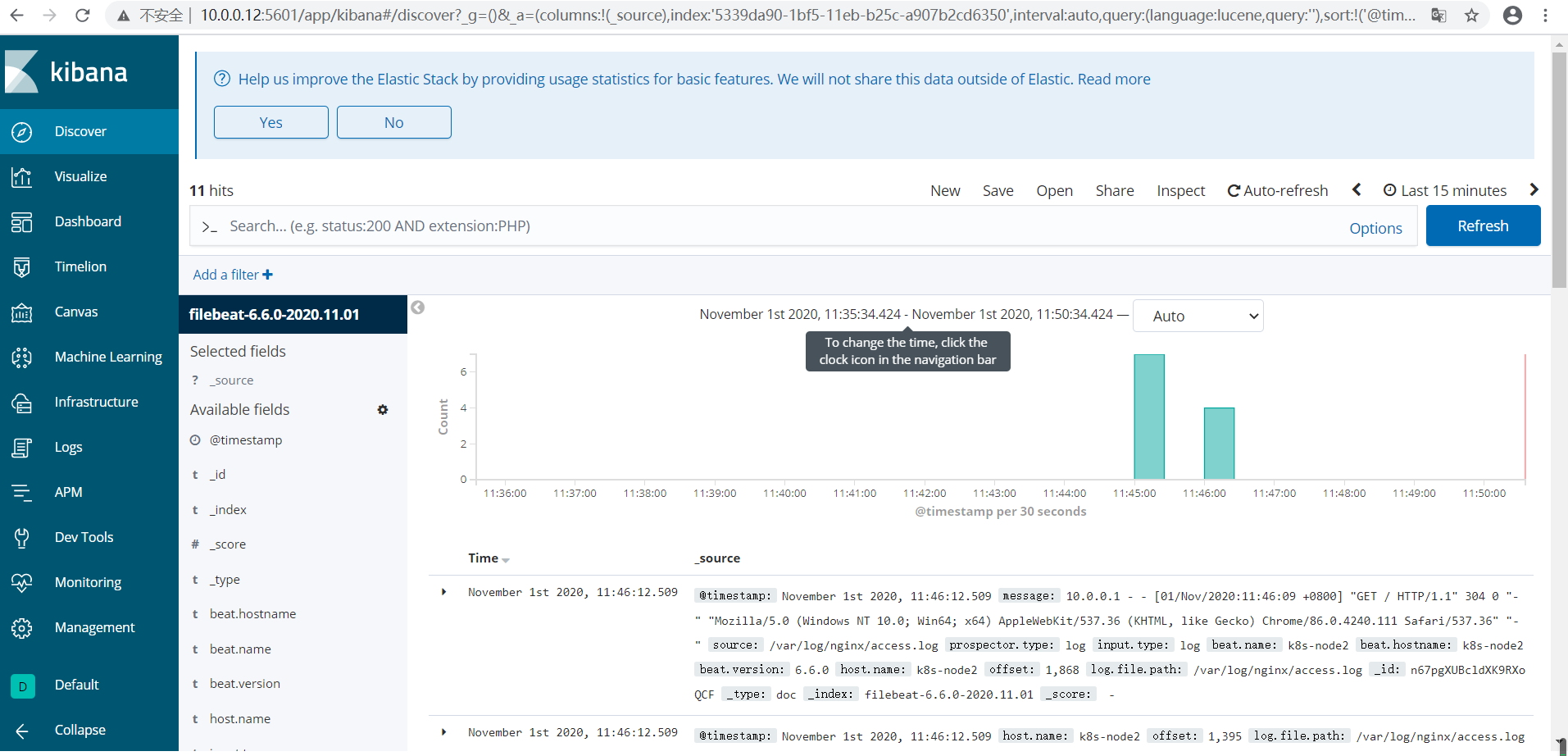 Management >> Index Patterns >> filebeat-6.6.0-2019.11.01 >> @timestamp >> create >> discover